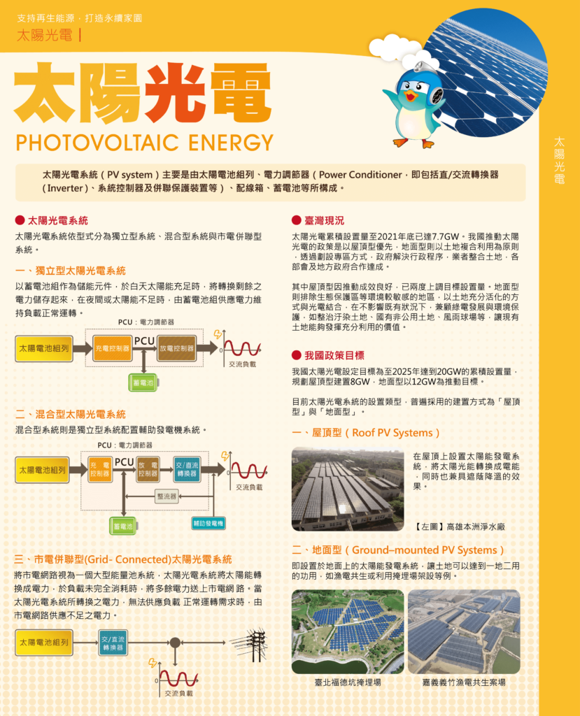 像是太陽光電的系統介紹、國內發展現況、政策目標等。