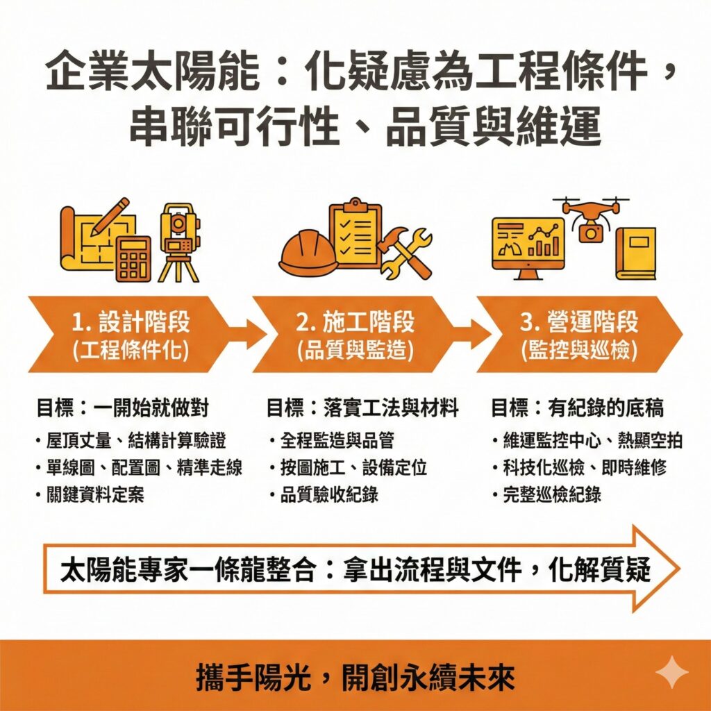太陽能專家讓瓦數,成為可交付資產。太陽能專家建議企業別再單看瓦數數字,而是透過完整系統整合,把選型、設計、驗收與維運一次規劃到位。讓太陽能專案不只是「瓦數高」,而是真正穩定運轉、可管理、可交付的企業能源資產。